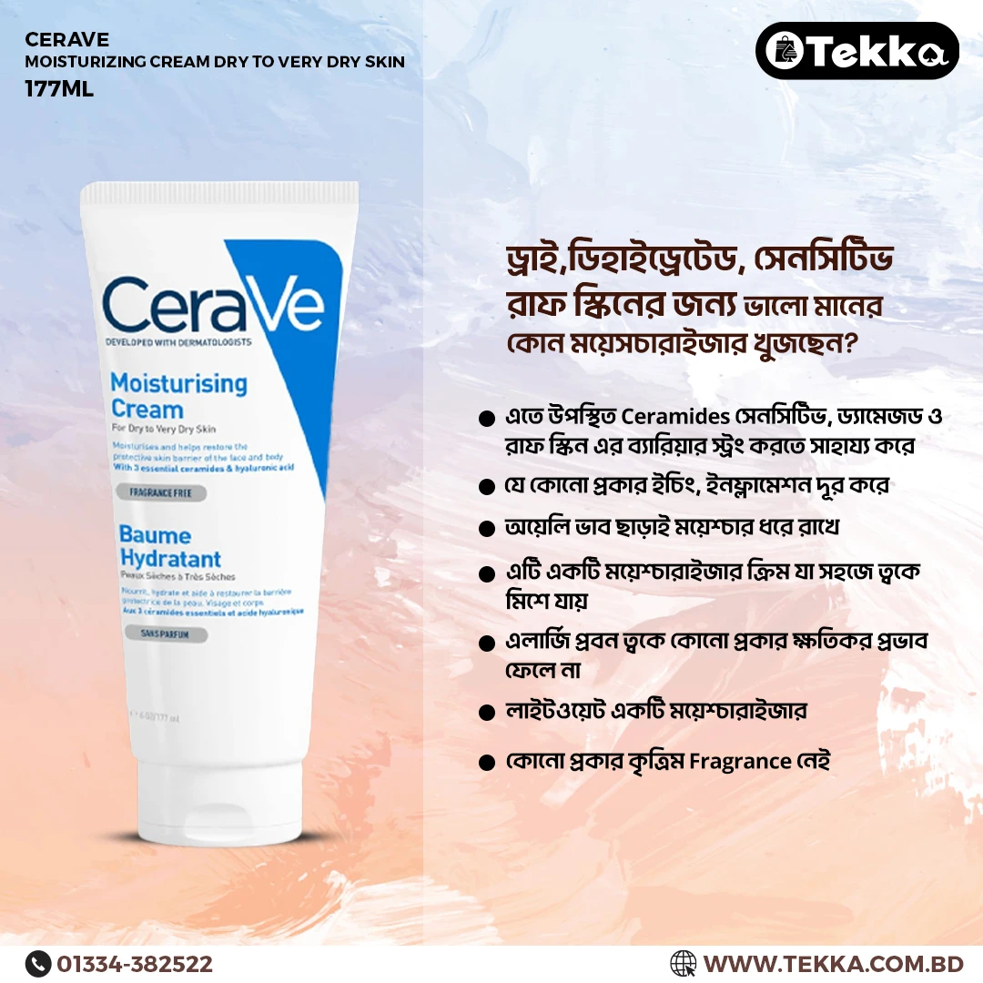 CeraVe Moisturizing Cream includes three essential ceramides and hyaluronic acid to effectively hydrate the skin and restore the skin’s protective barrier. Developed with dermatologists and suitable for dry and very dry skin on the face and body, this rich, non-greasy, fast-absorbing moisturizing cream features our patented MVE Delivery Technology to release a steady stream of moisturizing ingredients throughout the day and night. CeraVe Moisturizing Cream with ceramides is fragrance free.