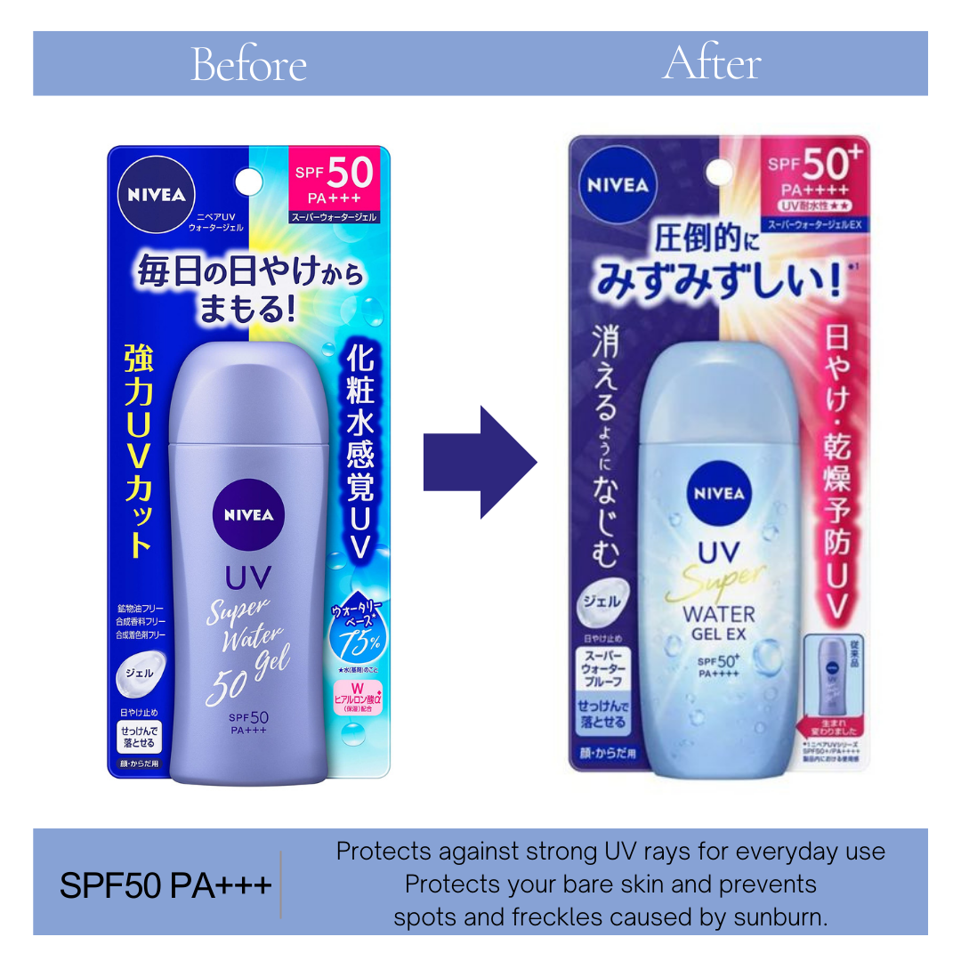 Nivea UV Super Water Gel EX SPF50 PA++++ is fitted with SPF 50+ PA+++ for sun protection, and its lightweight gel-like texture leaves skin feeling refreshed with no sticky residue. It can be applied on the face and body.