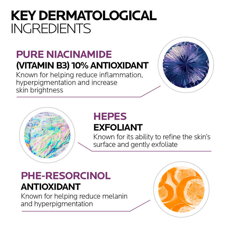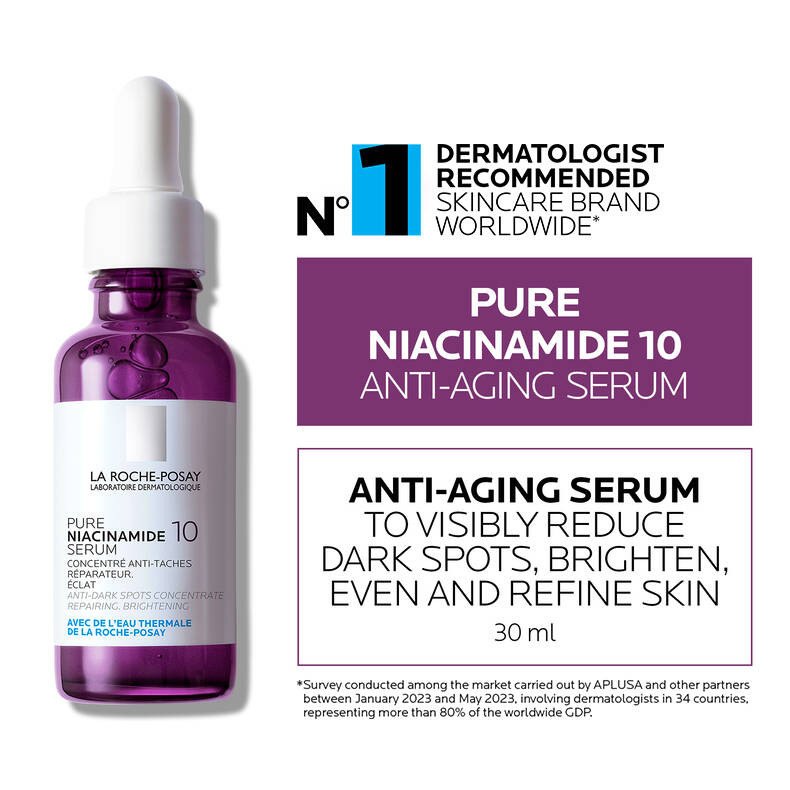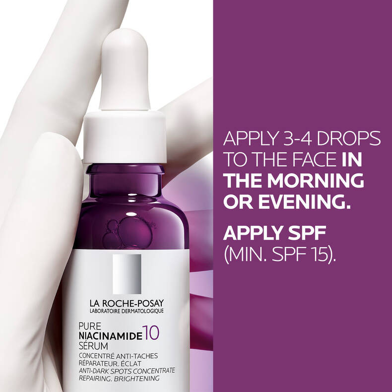 La Roche-Posay Pure Niacinamide 10 Serum is a dermatological anti-aging serum that targets dark spots, discolorations, and uneven skin tone. It contains 10% pure niacinamide, a powerful ingredient that helps fade hyperpigmentation, rebalance skin tone, and improve skin barrier function.
