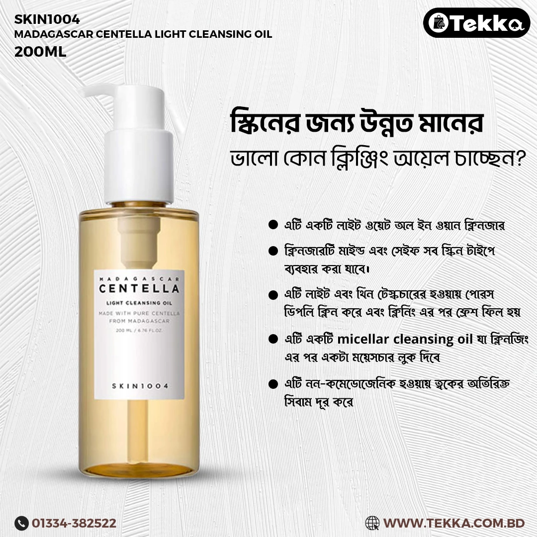 SKIN1004 Madagascar Centella Light Cleansing Oil 200ml, made with a blend of Centella Oil from Madagascar, the untouched nature, and 6 different plant-based oils, melt away surface impurities and makeup, and cleanses skin with a light-weight formula, leaving skin purified and refreshed.